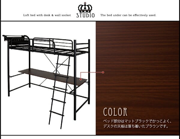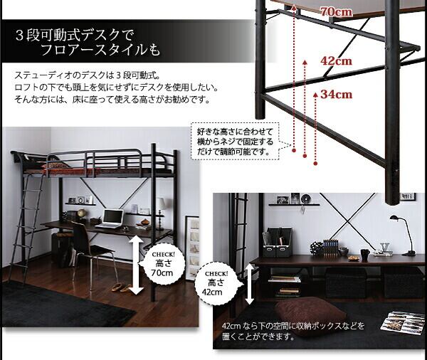 3段可動デスク&コンセント宮棚付きロフトベッド Studio ステューディオ