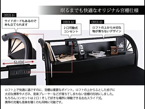 1灯照明とスライド式の1口コンセント。CDや本も置ける棚もついて便利が手に届く充足感です。